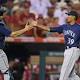 Mark J. Terrill. Seattle Mariners catcher Mike Zunino, left, and relief pitcher Edwin Diaz congratulate each other after the Mariners defeated the Los Angeles Angels 3-2 in a baseball game, Monday, Aug. 15, 2016, in Anaheim, Calif. (AP Photo/Mark J ...
